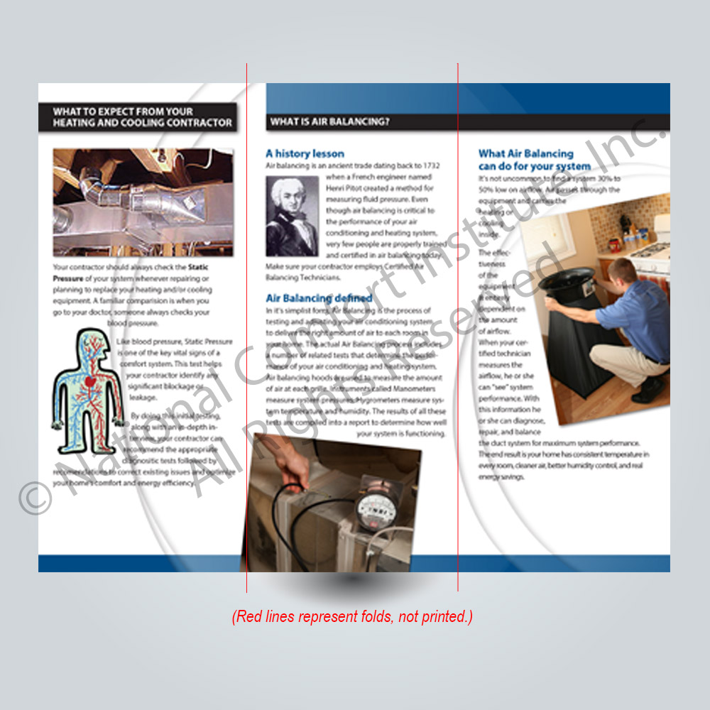 With these unique trifolds you can offer prospective customers a third-party source for information about what air balancing is and the importance of balancing an HVAC system in an easy-to-understand manner. Each brochure has a blank area that you can attach a business card or put a sticker with your company information. The brochures are not customizable, and are only available here.